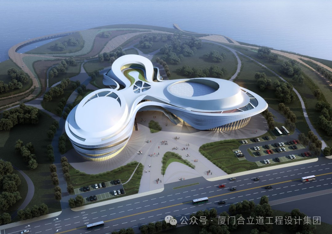 項目總體布局體現(xiàn)“園館合一”理念,以圓形形態(tài)體現(xiàn)開放、通達、親民的原則,與晉安湖融為一體,成為公園中的建筑,并與北側(cè)的福州市群眾藝術(shù)館遙相呼應(yīng)。兩館如雕琢的美玉,矗立在晉安湖畔,呈現(xiàn)“如意呈湖”的景致。