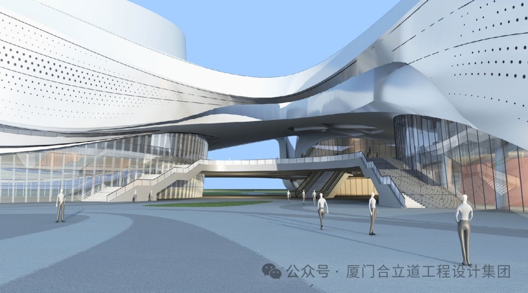 項目由劇場,藝術(shù)展覽、電影院,辦公及附屬設(shè)施三個建筑單體組成??傮w布局化整為零,減小建筑體量對周邊景觀的影響,三個單體中間連接通過共享平臺連接,形成景觀通廊,增強建筑群體的整體感。項目的主要人行出入口設(shè)置在北側(cè)明德路上,與體育中心相呼應(yīng)。地塊中北部設(shè)置人行入口廣場,建筑與周邊環(huán)境相結(jié)合,開放性的休閑空間收放有致,營造變化、充滿趣味性的學生、市民休閑空間。